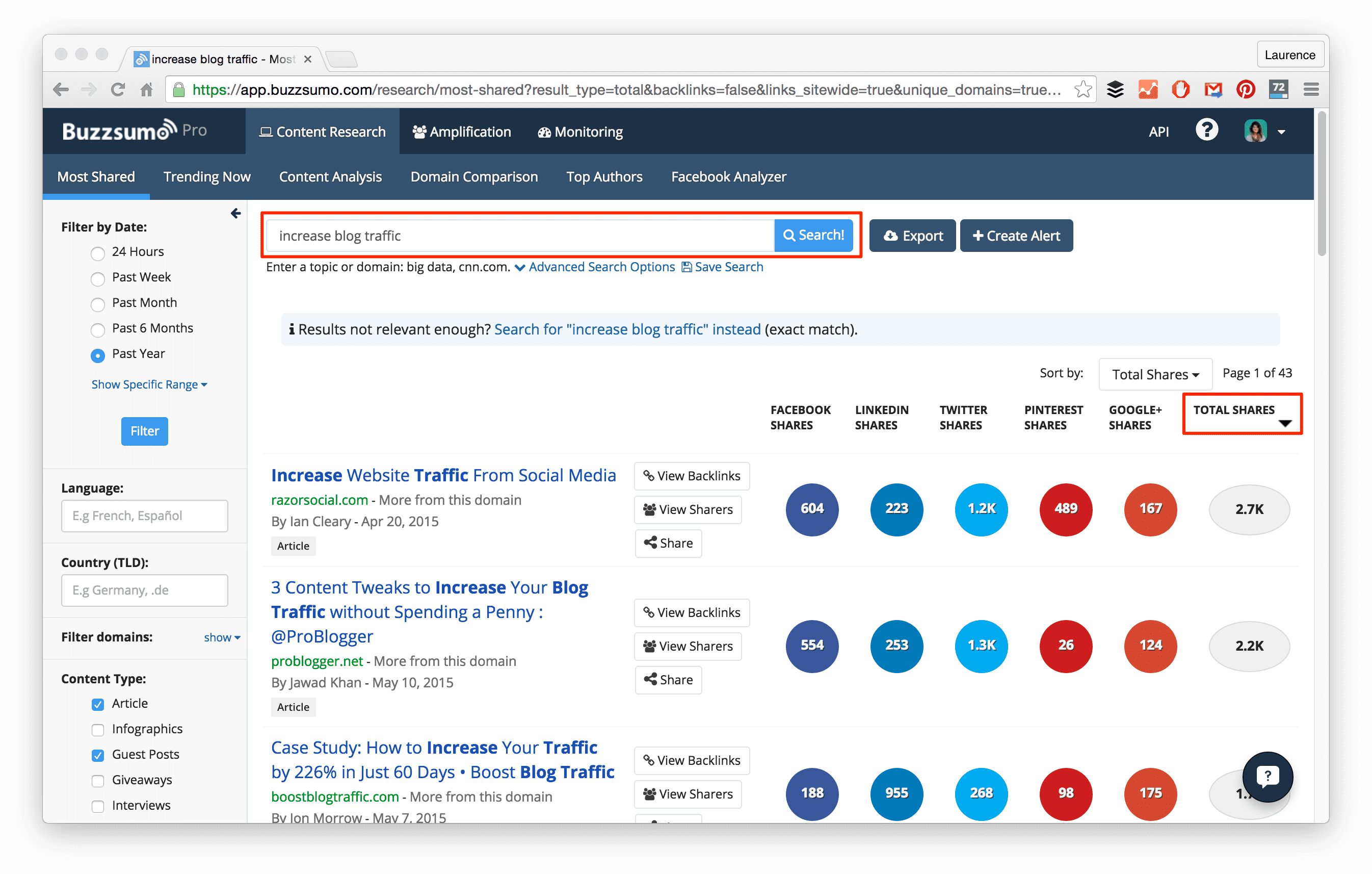 Buzzsumo allows you to see what content is most popular based on total social media shares. As you can see above, all I did was type in a phrase—like I did on Google. It’ll then generate a list of most-shared articles with those terms in the title.